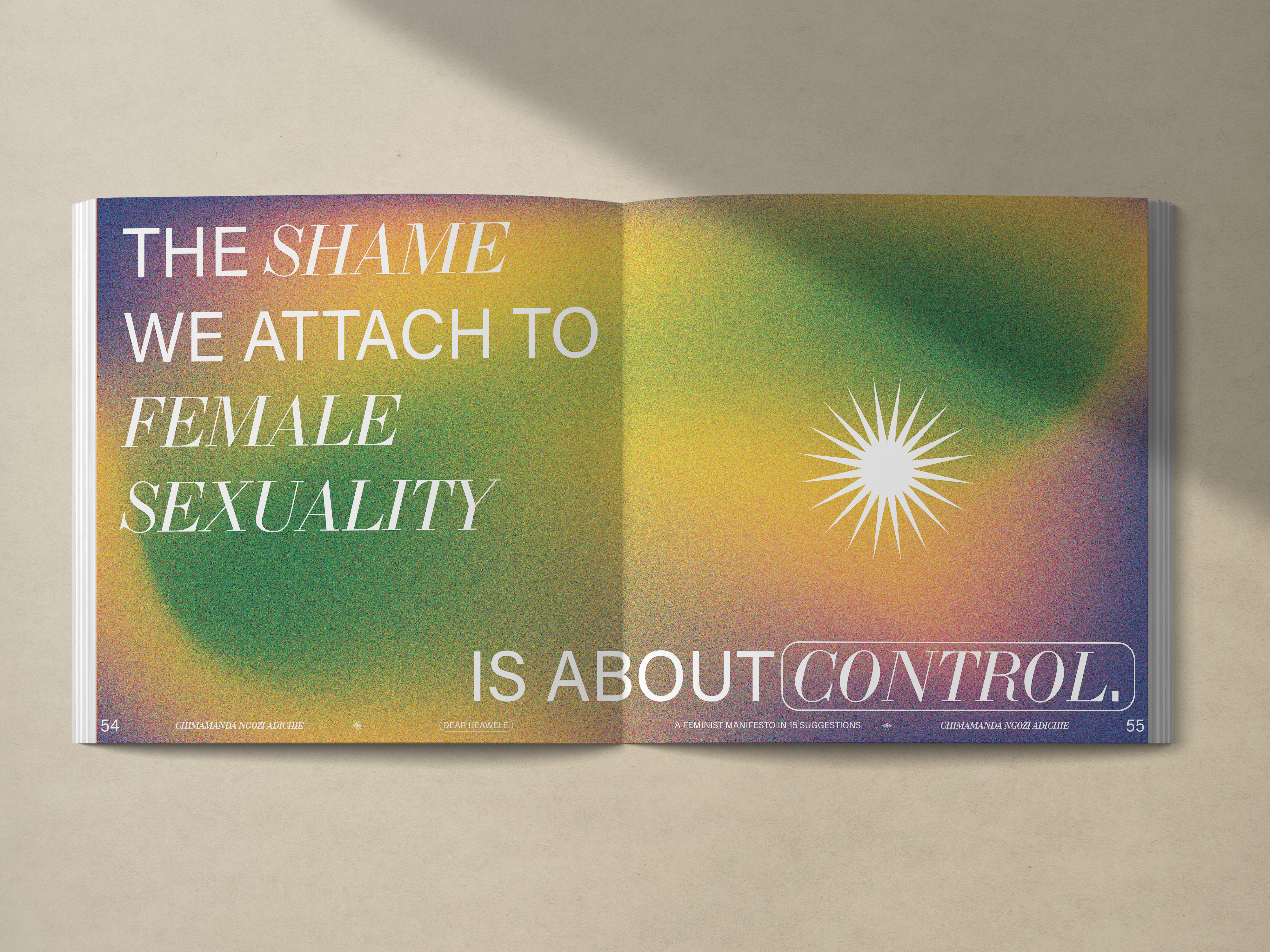 This manifesto was initially a collection of suggestions Adichie exchanged with a close friend of hers who was expecting a child, and who asked her how to raise her daughter as a feminist. I decided to section off this book into the 15 different suggestions that she Adichie gave her friend, and went for a more playful, interactive illustrated design direction inspired by children’s books. The manifesto and the eaccompanying website thus lends itself perfectly to shared learning moment between a parent and a child.