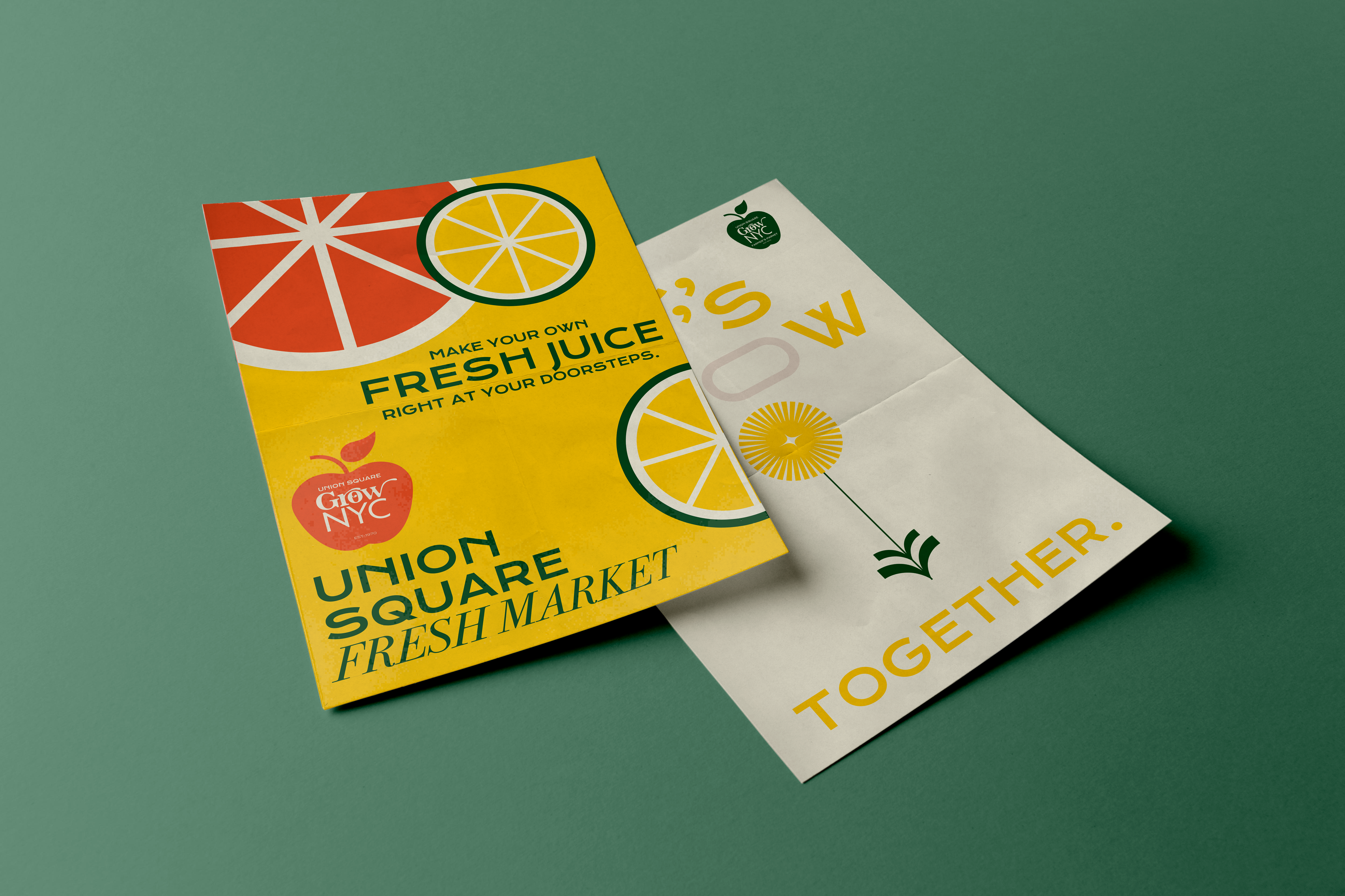 I decided to rebrand the Union Square’s Farmers Market. My goal for this rebranding was to create and rally a community around the farmer’s market, as well as educate said community about the environmental and cultural benefits of eating locally and seasonally.The tag line of this rebranding is “Let’s Grow Together.” I wanted this rebranding to appear inviting, playful and recognizable, in the goal of creating a feeling of shared joy, excitement and wonder when it comes to fresh eating and protecting/loving the planet.